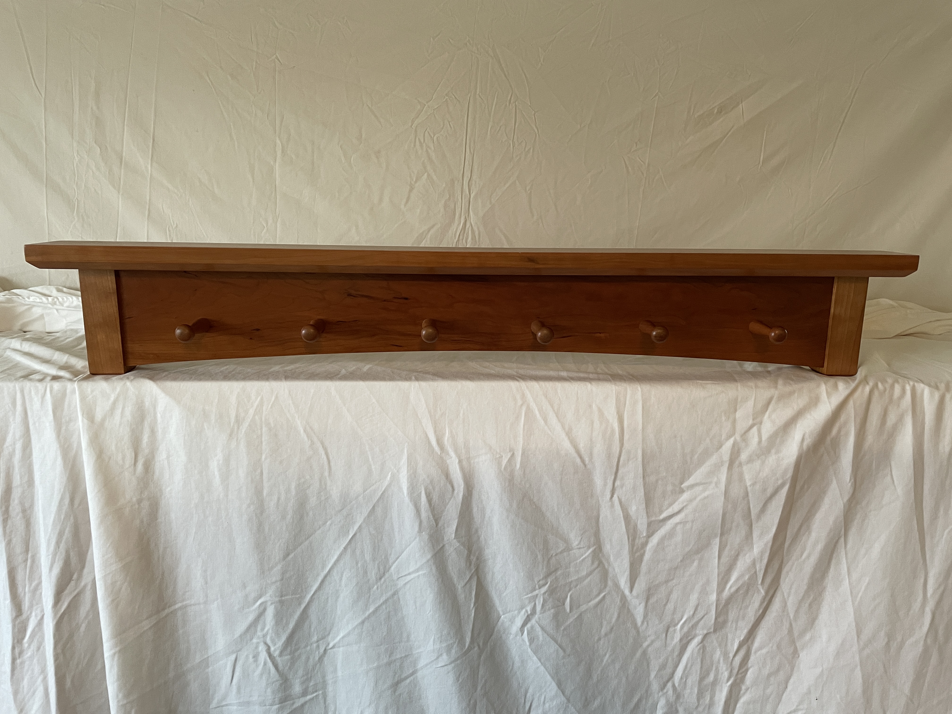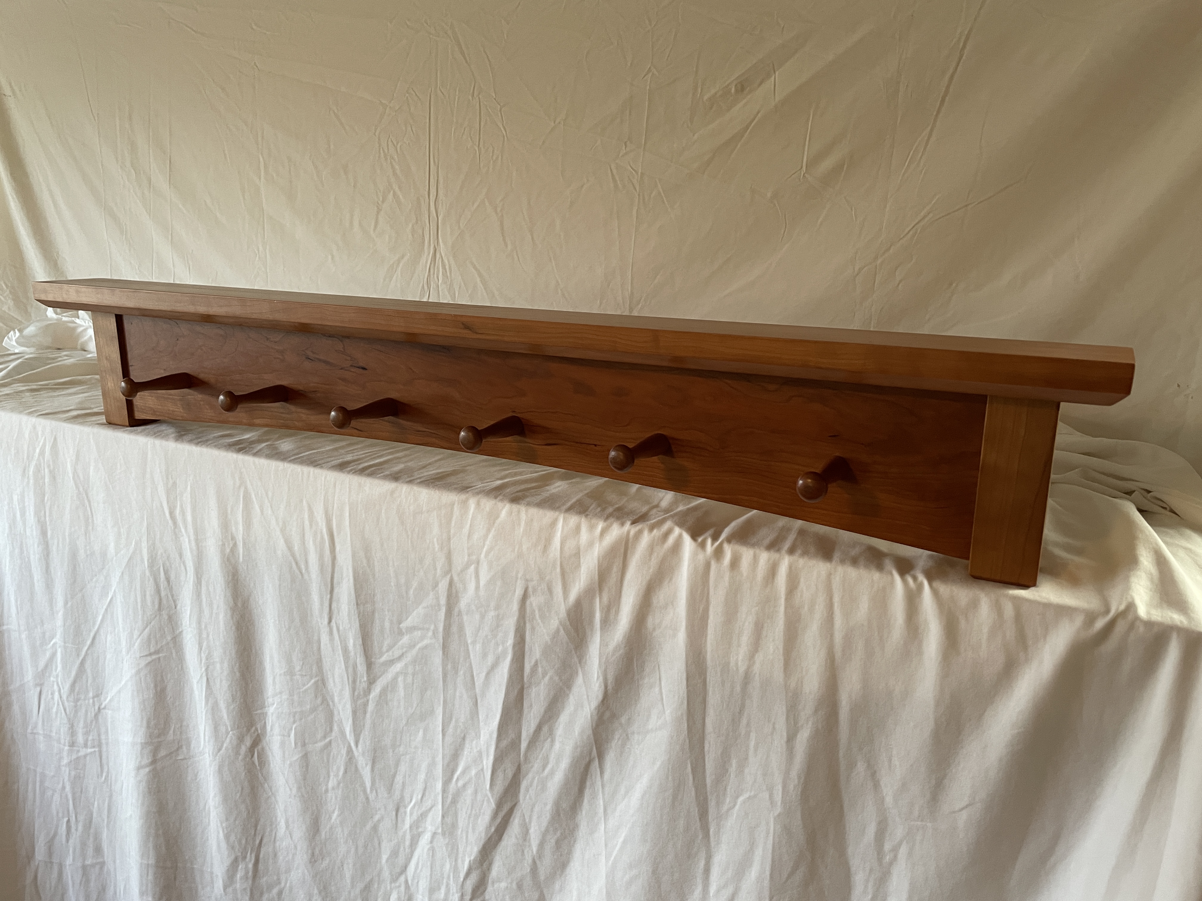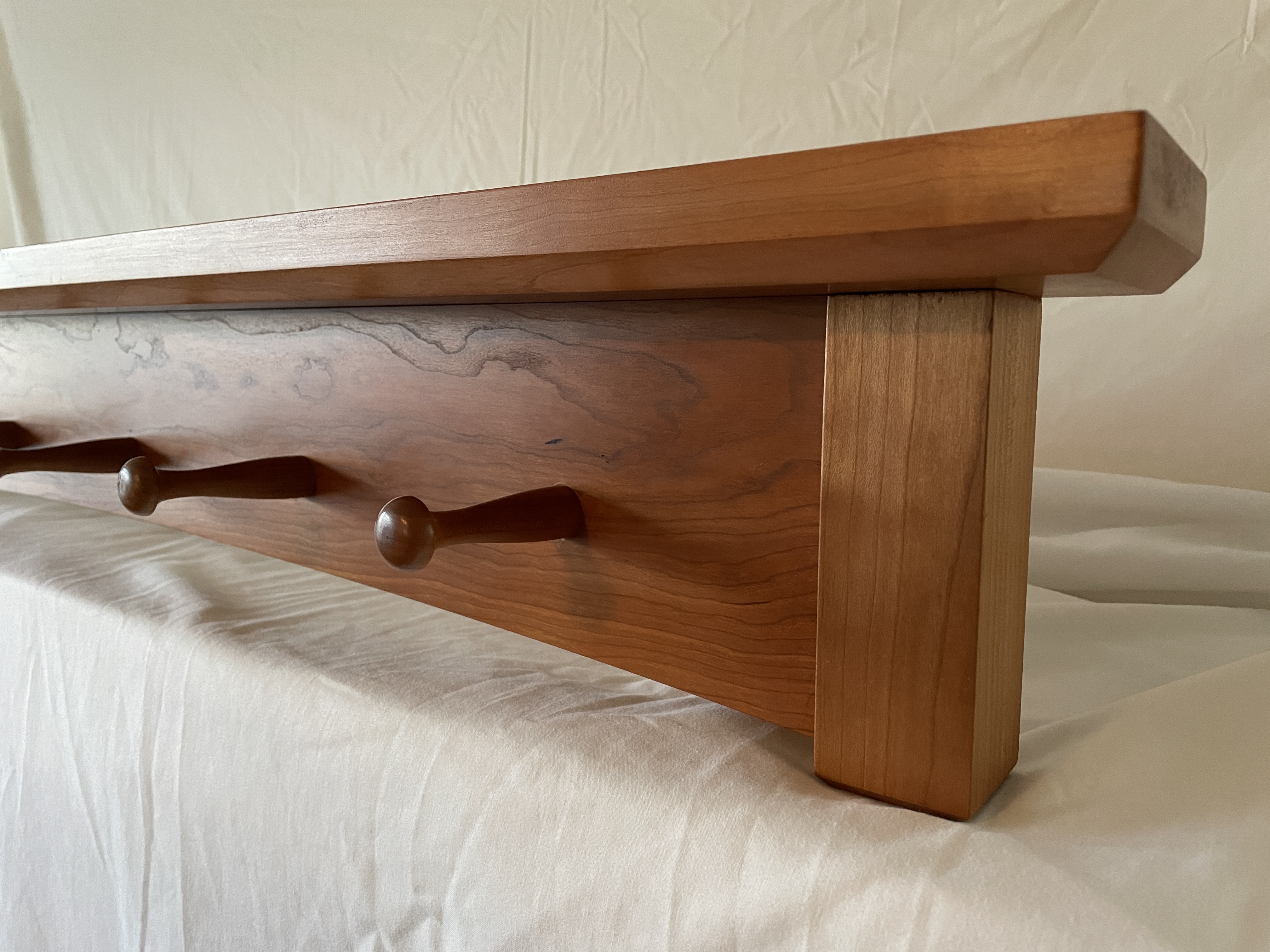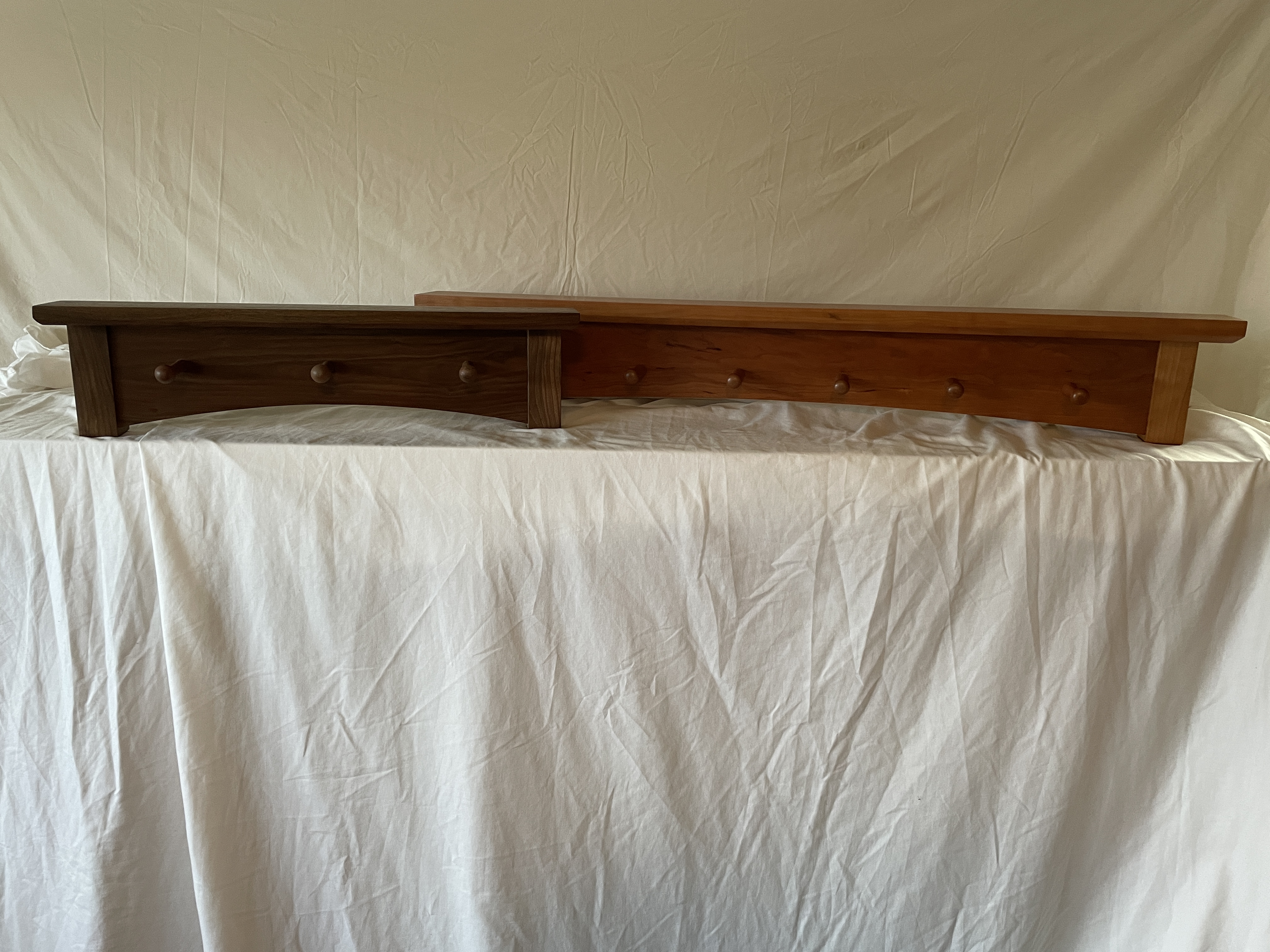 Multiple versions of various lengths in cherry or walnut. 8/4 stock for the vertical posts, 6/4 for the top shelf. Racks are flush-mounted to the wall with either a keyhole cut on the router table or recessed keyhole mounting plates.