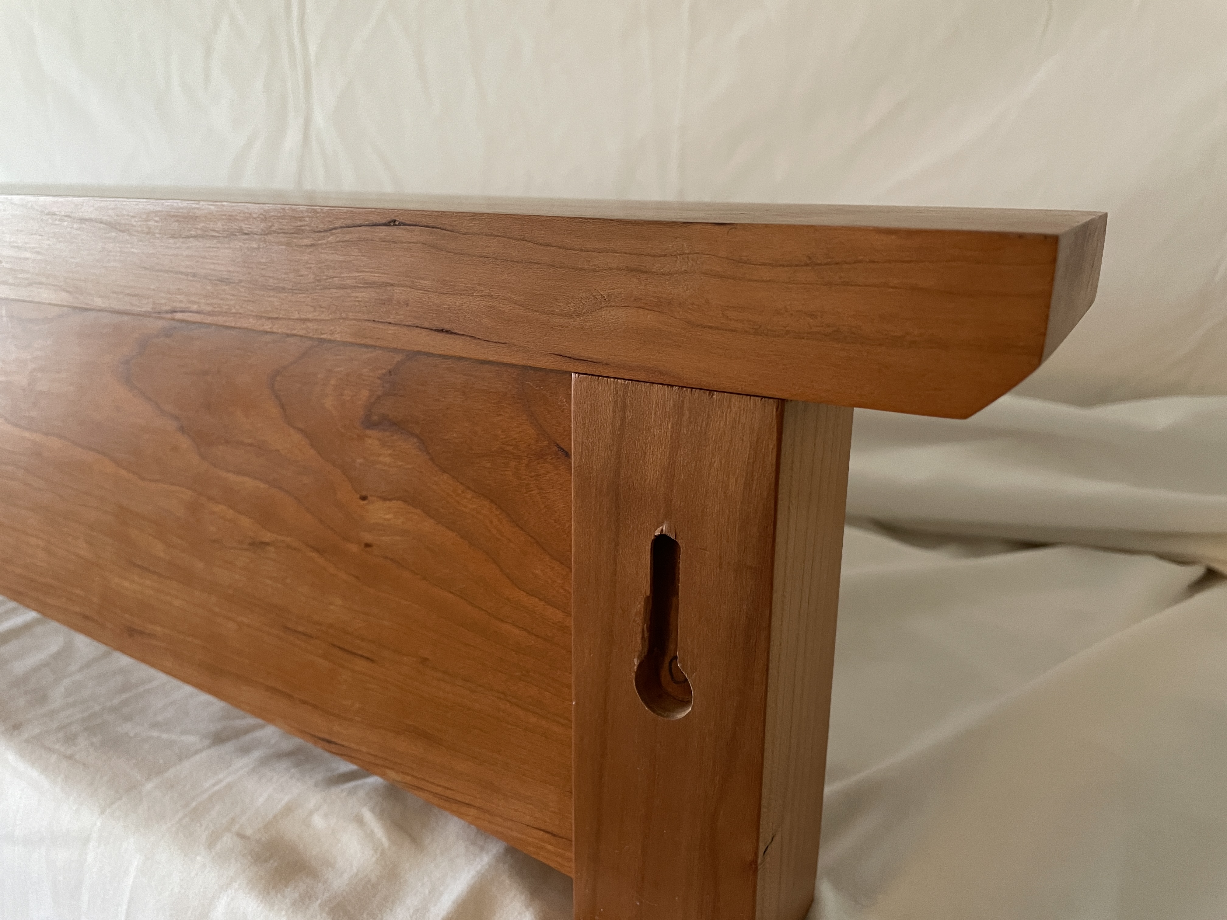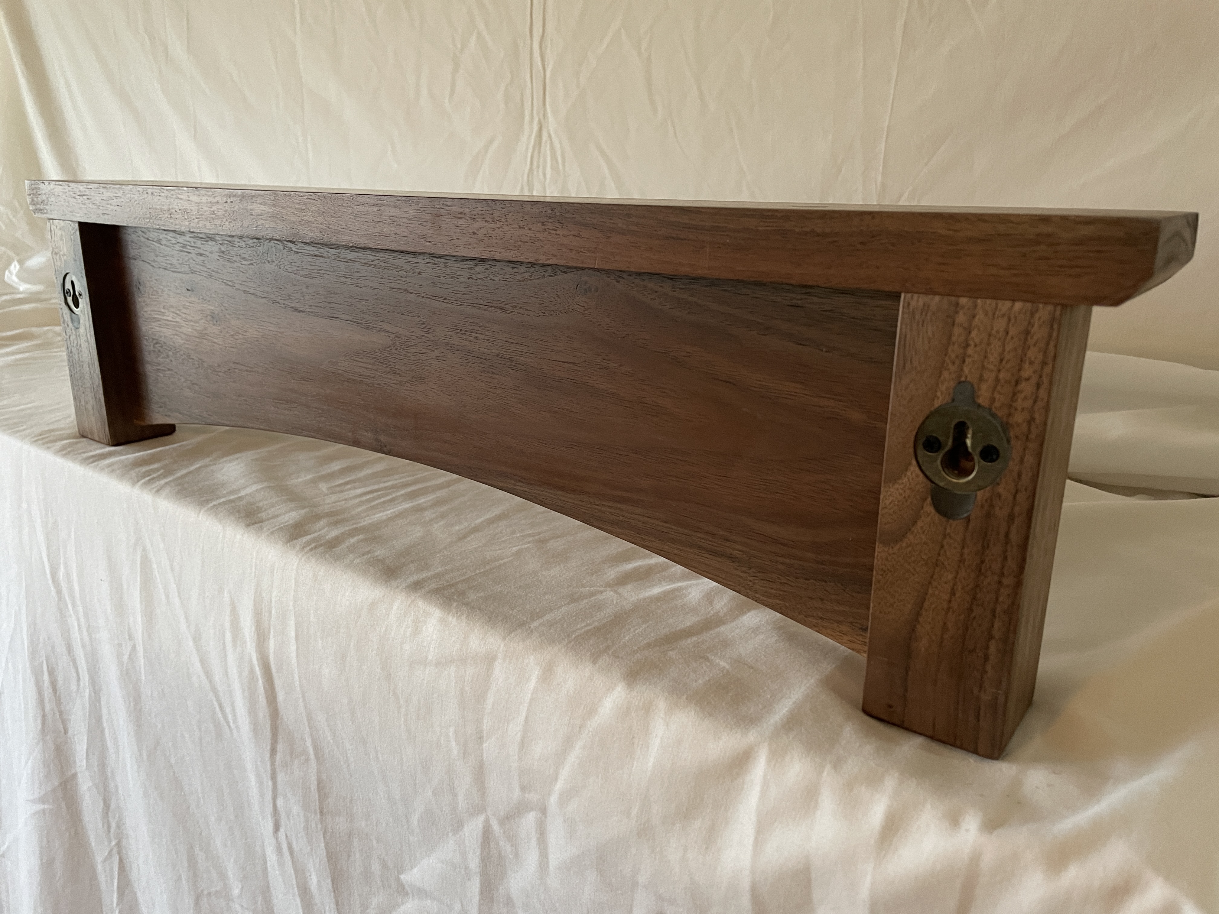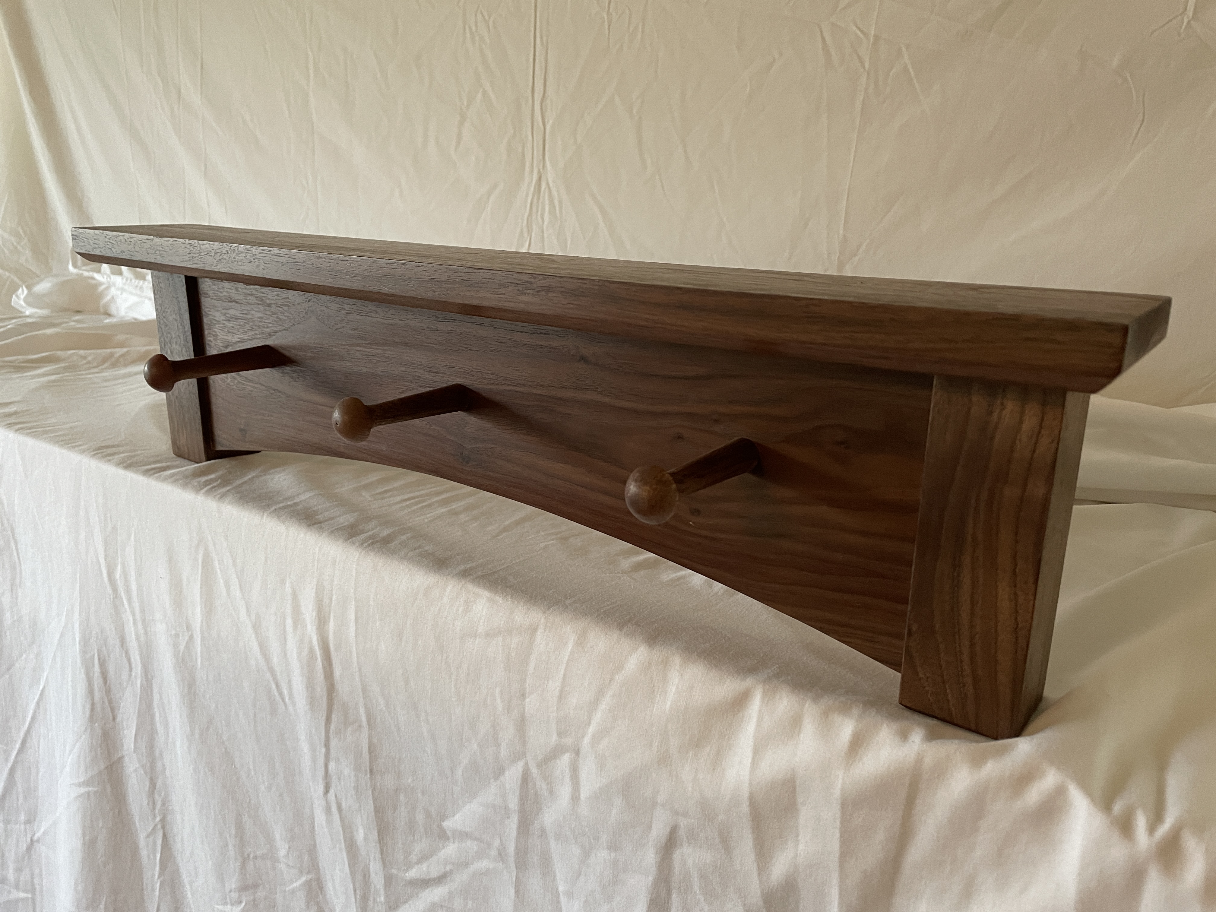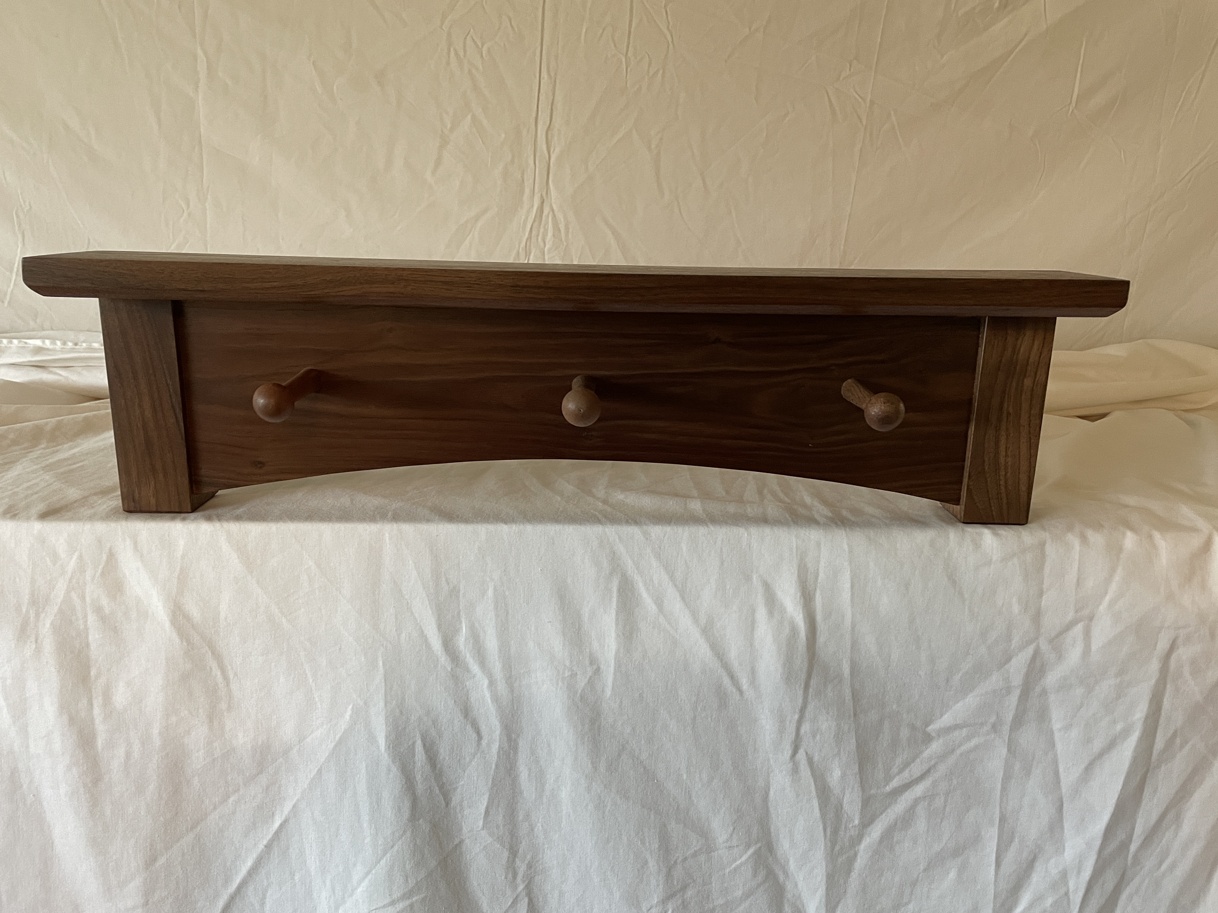Multiple versions of various lengths in cherry or walnut. 8/4 stock for the vertical posts, 6/4 for the top shelf. Racks are flush-mounted to the wall with either a keyhole cut on the router table or recessed keyhole mounting plates.