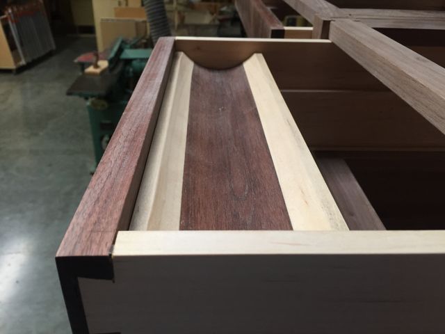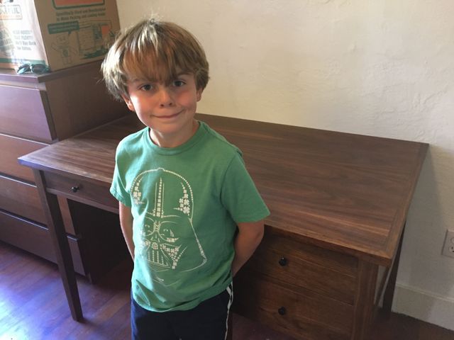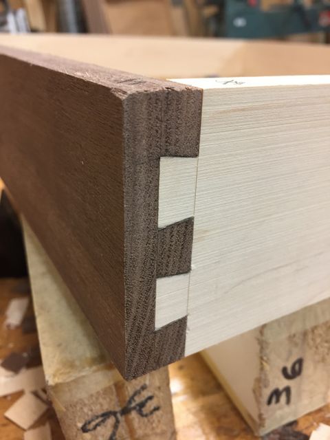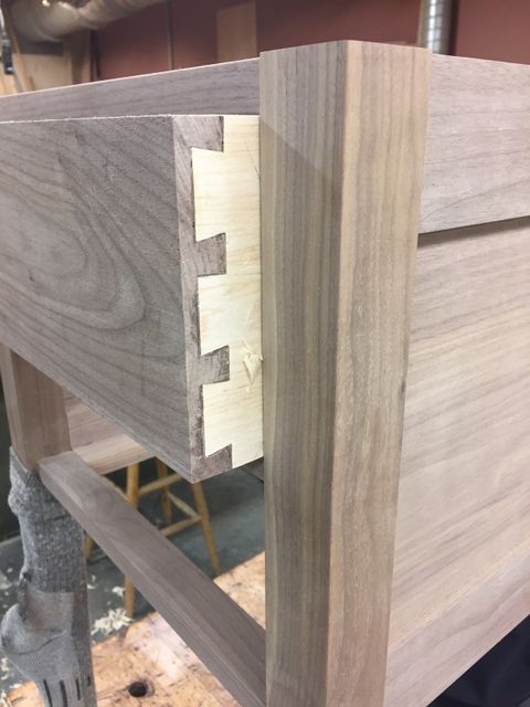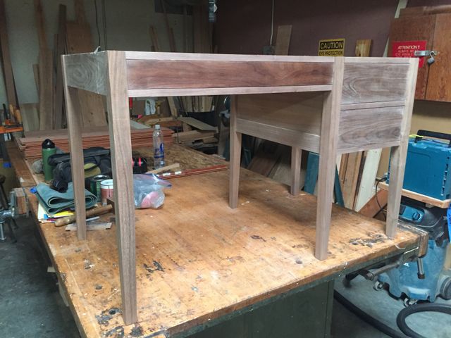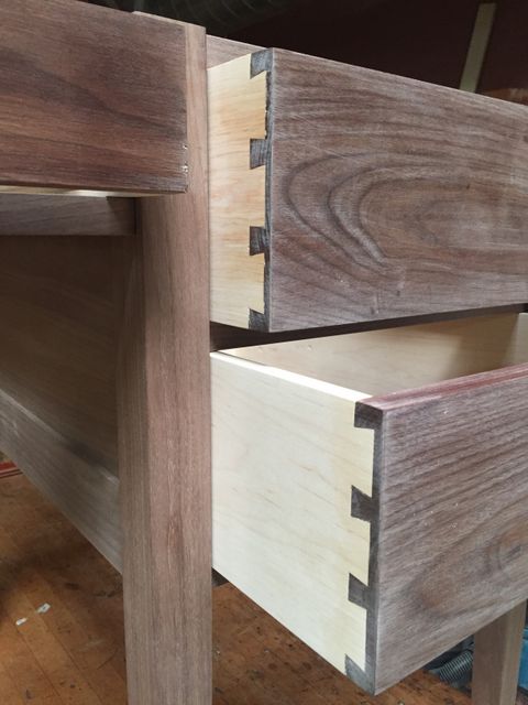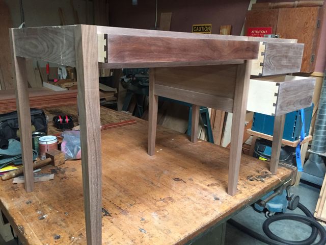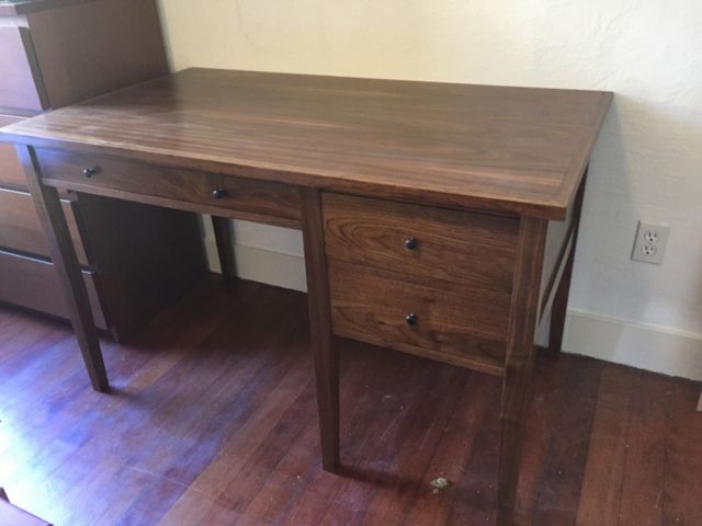 Three-drawer desk in walnut. Top is 3/4" veneered ply, edge-banded with 4/4 walnut. In-drawer pencil trays made from scrap walnut and maple.