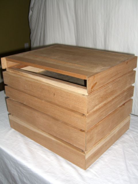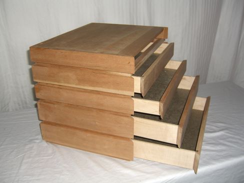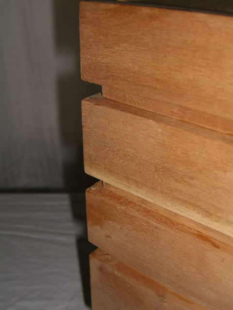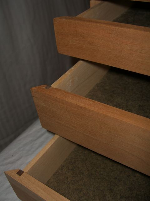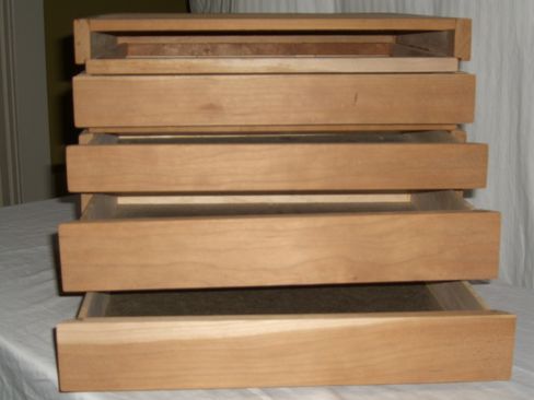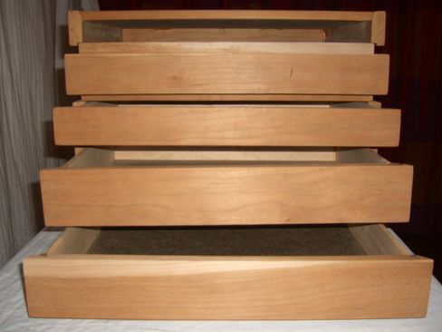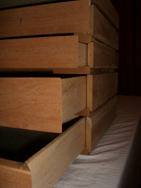 Cherry on the outside, maple on the inside. Five drawers, clean lines. Felt-lined drawers. Never finished the project; it now holds shop tools.