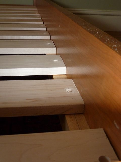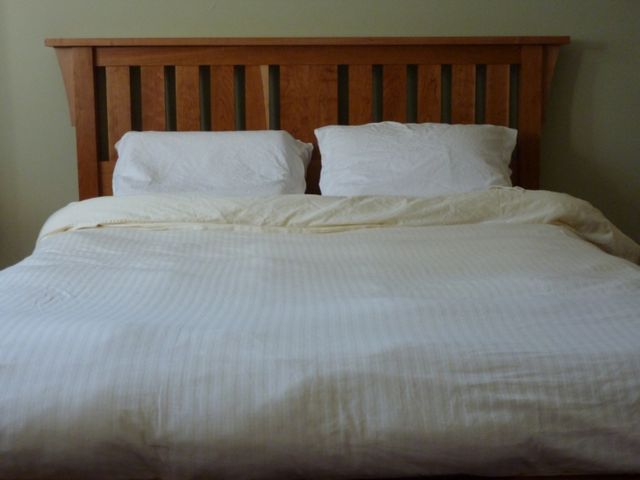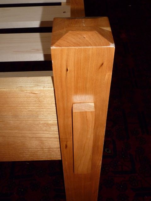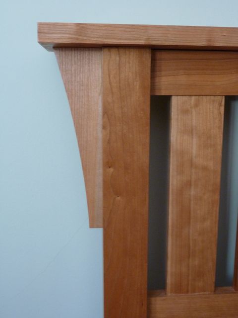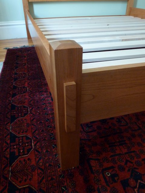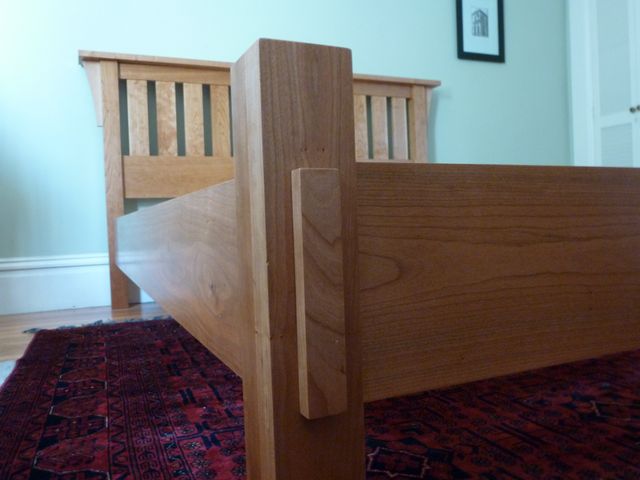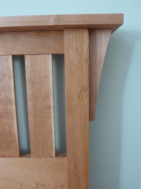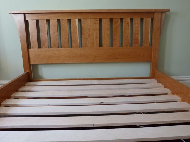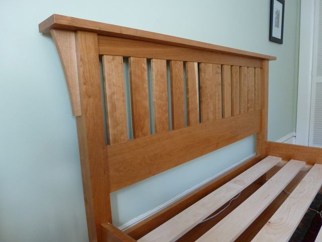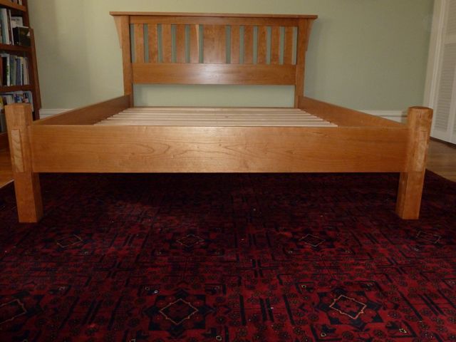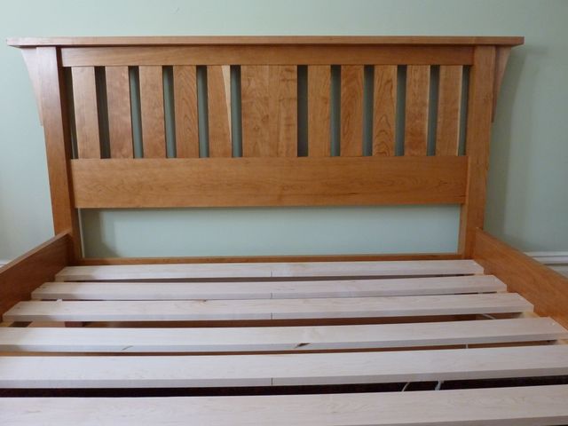 The design of this queen-sized bed harks back to the classic lines of the Morris chair, made famous by Gustav Stickley at the turn of the century. All cherry, except for the cleats and slats, which are rock maple.