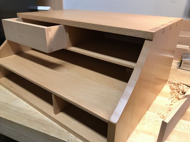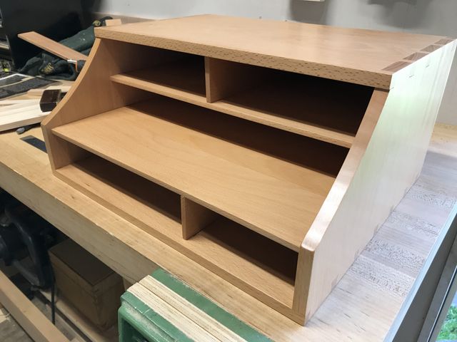 Fine Woodworking #285 featured a desktop organizer by Mike Pekovich. I added a few drawers and sized them to what I needed to store (hard drives, power cords, pens, envelopes). Beech throughout; five coats of Arm 'r Seal.