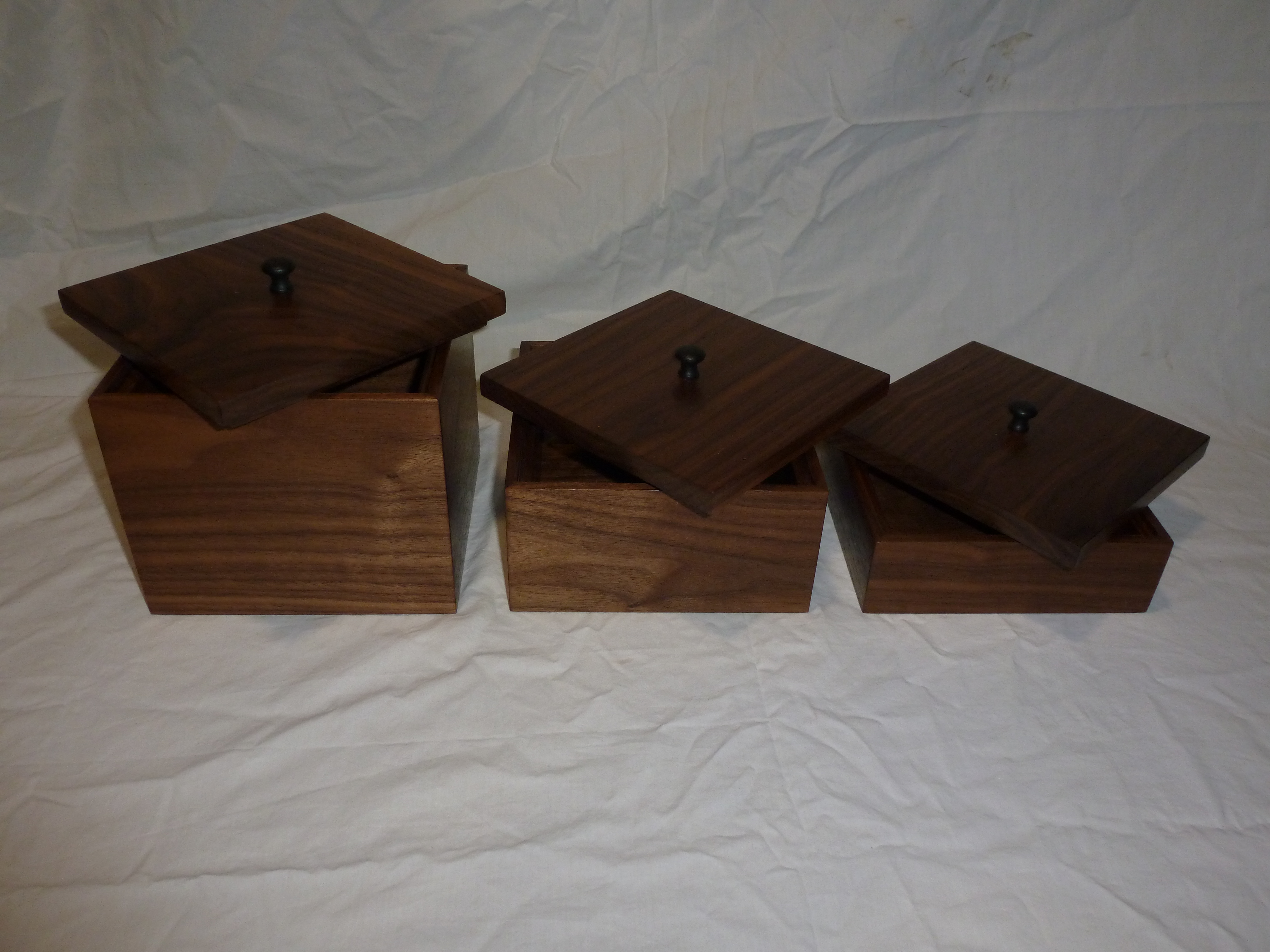 Offcuts from a larger project. Mitered corners, floating hardwood bottom. Tops sit inside of miters.