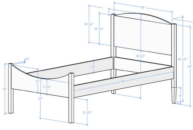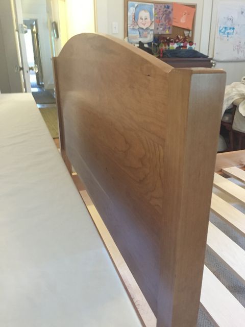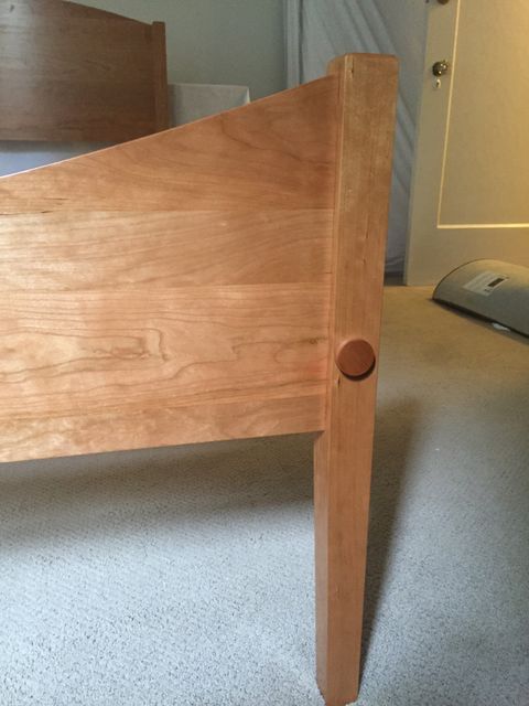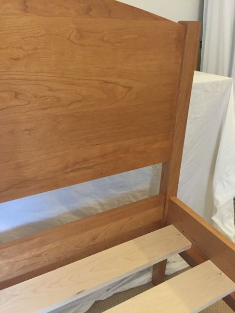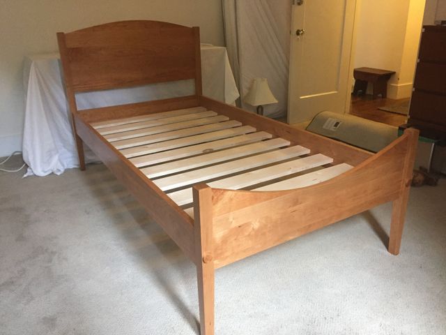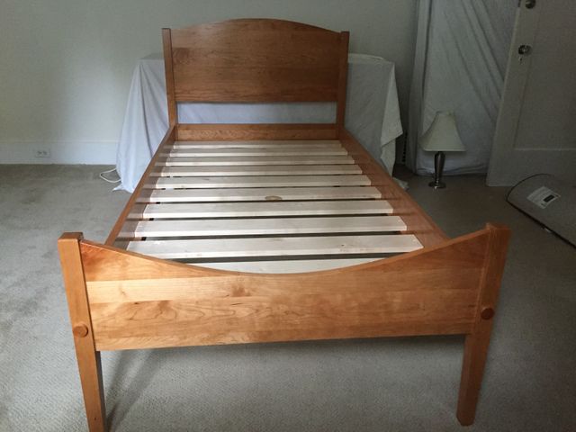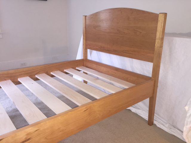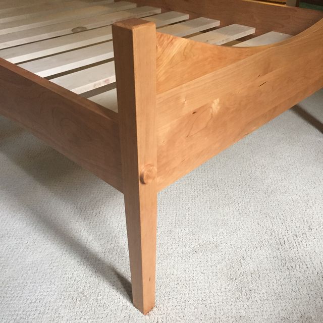 Cherry headboard and footboard, with matching half-moon profiles. Chamfered edges on the posts. Built somewhat long to accomodate a roll-away trundle bed. Hand-made wooden discs as caps for the assembly hardware. Six coats of Arm-R-Seal satin finish. Original design.